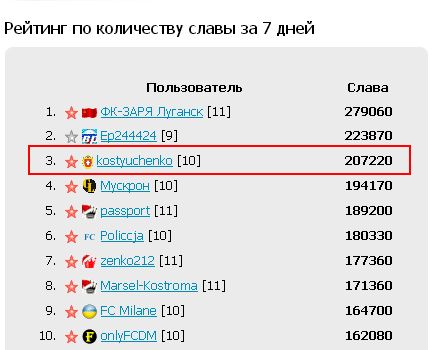 Менеджер ФС kostyuchenko в ТОП-3 проекту по славі